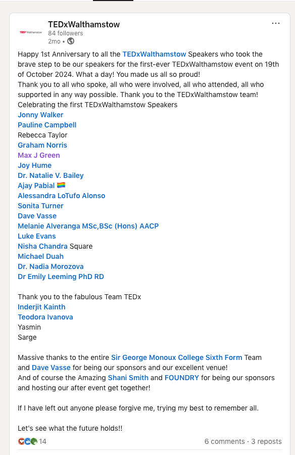 Max Mentioned by TEDxWalthamstow In Linkedin Post Celebrating 1 Year